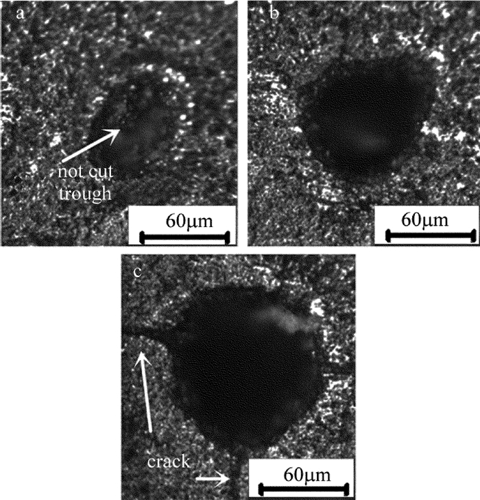 為了獲得聚晶立方氮化硼(PCBN)的激光切割質(zhì)量和切割效率,依據(jù)燒蝕直徑和入射激光脈沖能量的函數(shù)關系,得出PCBN燒蝕閾值為1.796J/cm2。采用Nd:YAG激光器對型號為BN250的PCBN進行切割試驗,分析了切割速率、激光功率以及脈沖頻率對切割質(zhì)量的影響規(guī)律。通過切縫的顯微觀測對比,總結出不同激光工藝參量下PCBN縫寬的變化趨勢。