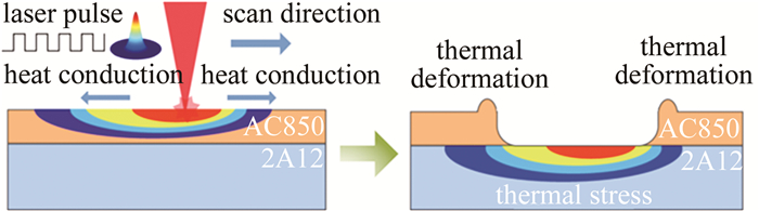 熱應(yīng)力耦合分析可以反映熱溫度場和應(yīng)力場的相互影響過程,根據(jù)求解步驟的不同, 分為直接求解法和間接求解法。直接求解法是利用包含溫度以及位移自由度的耦合單元,經(jīng)過一次求解計算同時得到熱分析和結(jié)構(gòu)應(yīng)力分析結(jié)果。間接求解法則需要分步進行,首先通過熱分析計算出模型的節(jié)點溫度,將求解的節(jié)點溫度作為體載荷施加到結(jié)構(gòu)應(yīng)力分析中,求解出節(jié)點應(yīng)力。由于直接求解法的平衡狀態(tài)需要同時滿足多個準則,復雜的約束條件使得節(jié)點自由度較多,并且矩陣方程繁雜,求解效率低。在鋁合金化銑保護膠激光刻型熱應(yīng)力耦合分析中,相較于結(jié)構(gòu)響應(yīng),熱分析的溫度對結(jié)構(gòu)分析時應(yīng)力應(yīng)變的影響更為顯著,因此本文中選擇效率較高的間接求解法來實現(xiàn)對鋁合金化銑保護膠激光刻型的熱應(yīng)力耦合分析。脈沖激光的刻蝕原理如圖 1所示,采用移動高斯熱源模擬長脈沖激光與目標材料的相互作用過程。