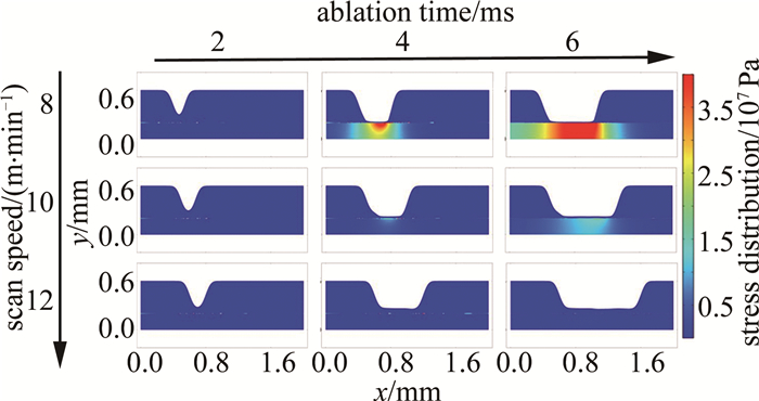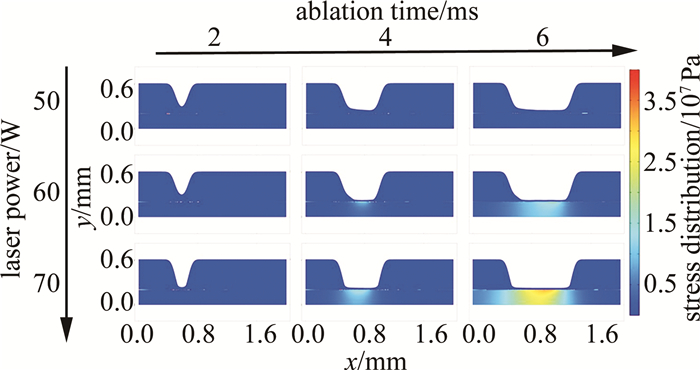 縱向觀察發(fā)現(xiàn),燒蝕時間恒定,燒蝕深度隨著激光功率的增大逐漸增大,同時,燒蝕區(qū)域底部對應(yīng)的保護膠與鋁合金的結(jié)合界面處出現(xiàn)了應(yīng)力集中現(xiàn)象,而應(yīng)力集中點也隨著激光功率的增大而顯著增多;其中燒蝕時間為4 ms、6 ms,激光功率為60 W、70 W時,保護膠與鋁合金的結(jié)合界面處開始出現(xiàn)應(yīng)力集中現(xiàn)象,且應(yīng)力集中區(qū)隨著激光掃描路徑延伸逐漸擴大,應(yīng)力至高點出現(xiàn)在掃描區(qū)域的中心位置,且對鋁合金基體材料產(chǎn)生了應(yīng)力影響。橫向觀察發(fā)現(xiàn),激光功率為50 W時,整個燒蝕過程中沒有出現(xiàn)特別明顯的應(yīng)力集中區(qū),這是因為激光功率較小時,保護膠材料不能被完全燒蝕,所以保護膠與鋁合金的結(jié)合界面處并未產(chǎn)生明顯應(yīng)力;同燒蝕深度的變化規(guī)律,其應(yīng)力影響區(qū)域面積與應(yīng)力數(shù)值也隨著激光功率的增大而增大。仿真計算結(jié)果表明:激光功率越大,燒蝕深度越深;激光焦點距保護膠與鋁合金的結(jié)合界面處越近,界面處產(chǎn)生的應(yīng)力就越大,由于鋁合金是熱的良導體,較高的傳熱性能使其在激光刻型時,容易產(chǎn)生更大范圍的應(yīng)力區(qū)域與更高的應(yīng)力值。