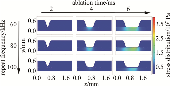 圖 4是以激光重復頻率為變量的仿真結(jié)果。選取60 kHz, 80 kHz, 100 kHz為參數(shù)節(jié)點,其余仿真條件如下:激光功率為60 W、掃描速率為10 m/min。燒蝕時間節(jié)點選擇與圖例設(shè)置同圖 2。觀察發(fā)現(xiàn), 激光重復頻率為60 kHz, 80 kHz時,燒蝕過程中產(chǎn)生的應(yīng)力區(qū)域與應(yīng)力值差別較小但顯著大于重頻為100 kHz時的情況。3種重頻下的燒蝕深度并無明顯差別,說明在激光功率與掃描速率相同的情況下,脈沖激光的重復頻率對燒蝕效果的影響并不顯著,但卻會帶來燒蝕過程中應(yīng)力的變化,這對調(diào)整激光加工工藝有重要的指導意義。