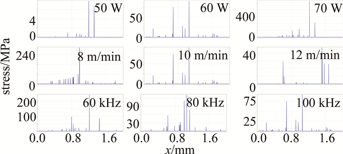 (2) 應(yīng)力極值與激光功率呈正相關(guān),與掃描速率和重復頻率呈負相關(guān),其中激光功率對應(yīng)力極值的影響較為顯著。由于鋁合金是熱的良導體,較高的傳熱性能使其在激光刻型時,更易產(chǎn)生大范圍的應(yīng)力區(qū)域與更高的應(yīng)力值。