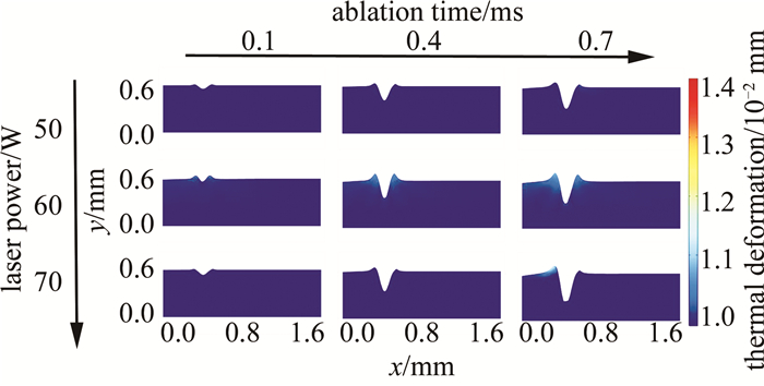 圖 6為不同激光功率對保護膠刻型形貌的影響示意圖。以激光功率為變量,分別選取50 W, 60 W, 70 W為參數(shù)節(jié)點,根據(jù)激光燒蝕時間選擇3個時間節(jié)點分別為0.1 ms, 0.4 ms, 0.7 ms。在9個仿真結(jié)果中,材料因熱應(yīng)力而產(chǎn)生的位移通過顏色圖例顯示,至高為1.4×10-2 mm,低為0.98×10-2 mm。