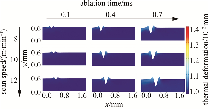 圖 7是以掃描速率為變量的仿真結(jié)果。分別選取8 m/min, 10 m/min, 12 m/min為參數(shù)節(jié)點,其余加工參數(shù)如下:激光功率為60 W、重復頻率為100 kHz。燒蝕時間節(jié)點選擇與圖例設(shè)置同圖 6。觀察圖 7發(fā)現(xiàn),掃描速率為8 m/min時,保護橡膠產(chǎn)生的熱變形較大。這是因為掃描速率的增大會引起脈沖重疊率的減小,且會明顯降低激光刻型過程中熱效應(yīng)的累積現(xiàn)象,同時也會減小切口的熱變形程度。