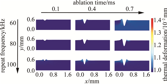圖 8是以重復頻率為變量的仿真結(jié)果。分別選取60 kHz、80 kHz、100 kHz為參數(shù)節(jié)點, 其余仿真條件如下:激光功率為60 W、掃描速率為10 m/min。燒蝕時間節(jié)點選擇與圖例設(shè)置同圖 6。觀察圖 8發(fā)現(xiàn),掃描時間恒定時,重復頻率以選取的參數(shù)節(jié)點變化; 重復頻率為60 kHz、80 kHz時,切口形貌、燒蝕深度無明顯變化,當重復頻率達到100 kHz時,形貌變化較明顯,且切口處產(chǎn)生了較大的熱變形現(xiàn)象。