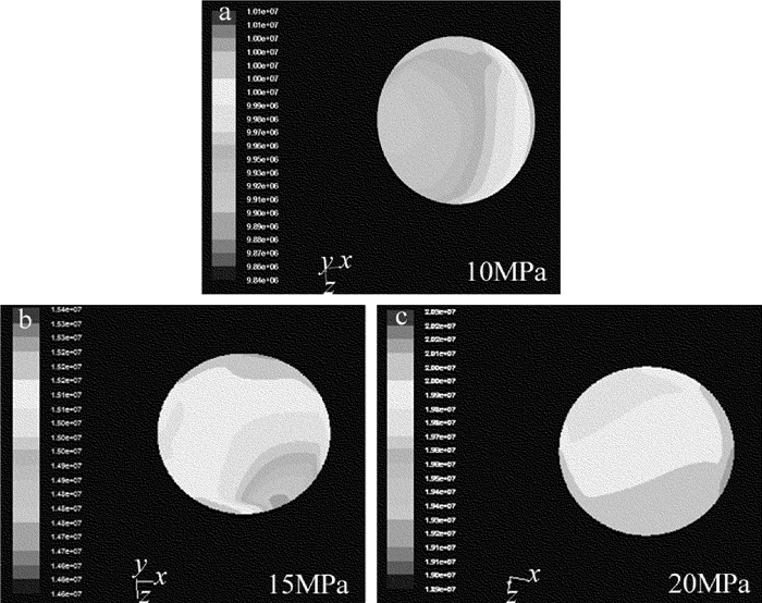 首先是殘差圖的收斂計算,設(shè)計的收斂參量為1×10-3。圖 4為殘差圖的收斂計算結(jié)果,橫坐標(biāo)為迭代次數(shù),縱坐標(biāo)為殘差值的大小。圖 5為單注水口耦合腔頂部水流入口壓力分布圖,縱坐標(biāo)為水束壓力大小(MPa)。由圖 5可以看出:當(dāng)水束壓力為10MPa時,水流入口處壓力分布非常不均勻,具有明顯的各向異性,且注水口一側(cè)的壓力明顯較大;隨著水束壓力的不斷增大,水束壓力的各向異性逐漸減弱,在水束壓力達(dá)到20MPa時,入口的水壓趨近均勻。